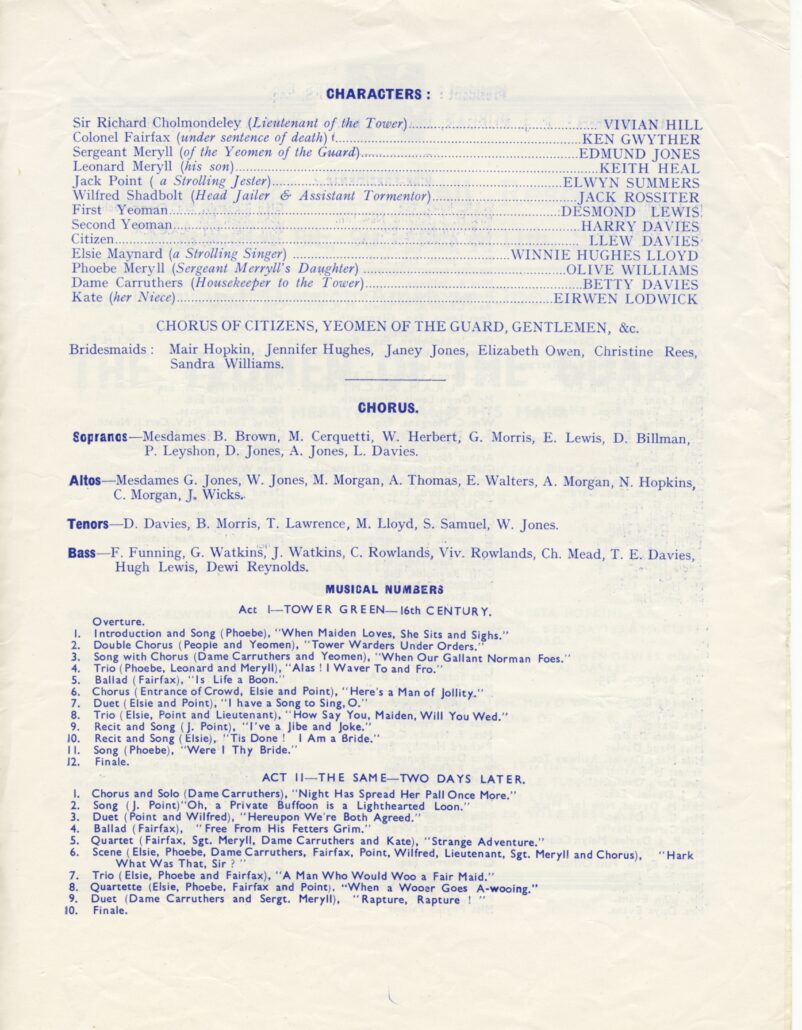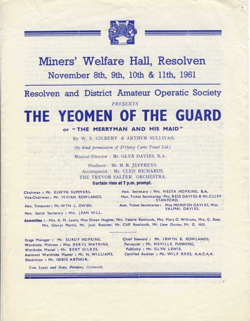 For the 1961 Stage Production there was a return to the Gilbert & Sullivan Opera ‘The Yeomen of the Guard’ performed from 8 -11 November at Resolven Welfare Hall. The performances Directed by long time member and local Teacher Mr Mervyn Jeffreys as always, were very well received by the public.
