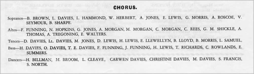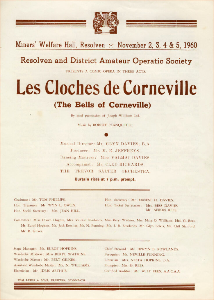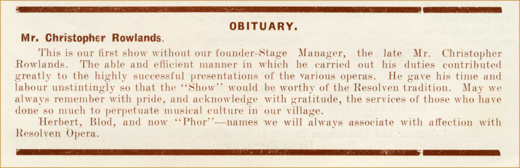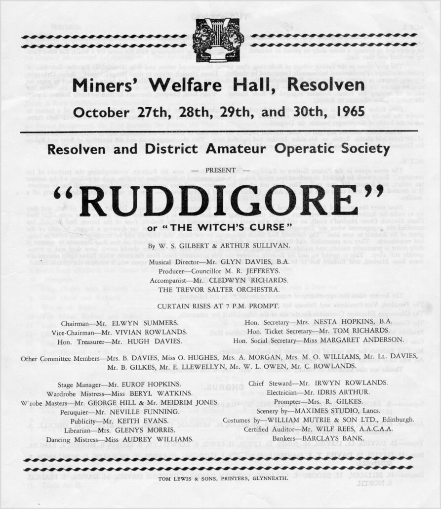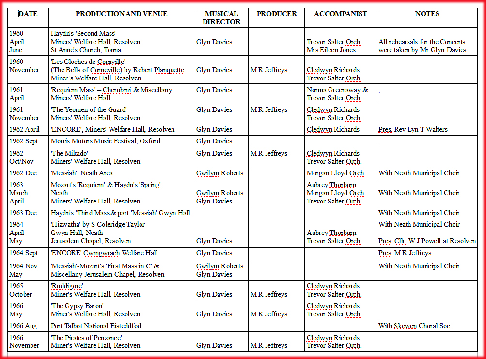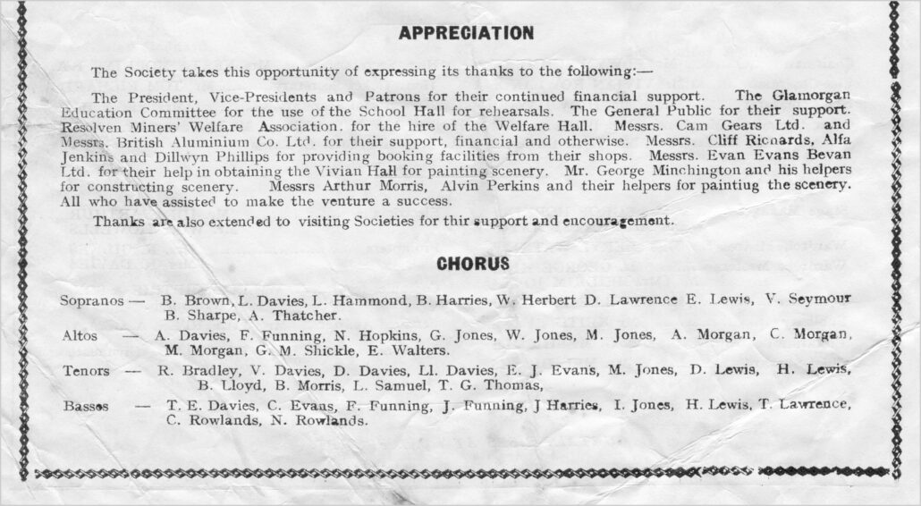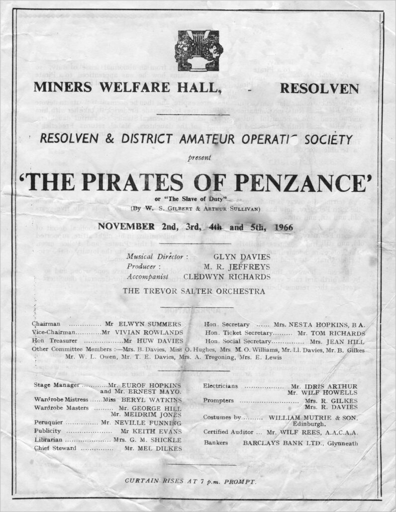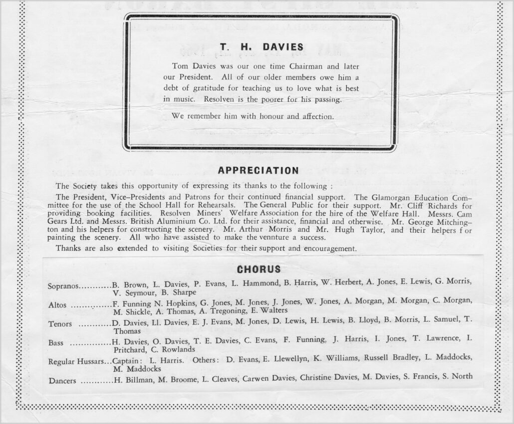 Some information taken from ‘Resolven Operatic Society’ – ‘A History from 1925 ~ 1976’ by Nesta Hopkins with additional information from Owen & Christine Davies.