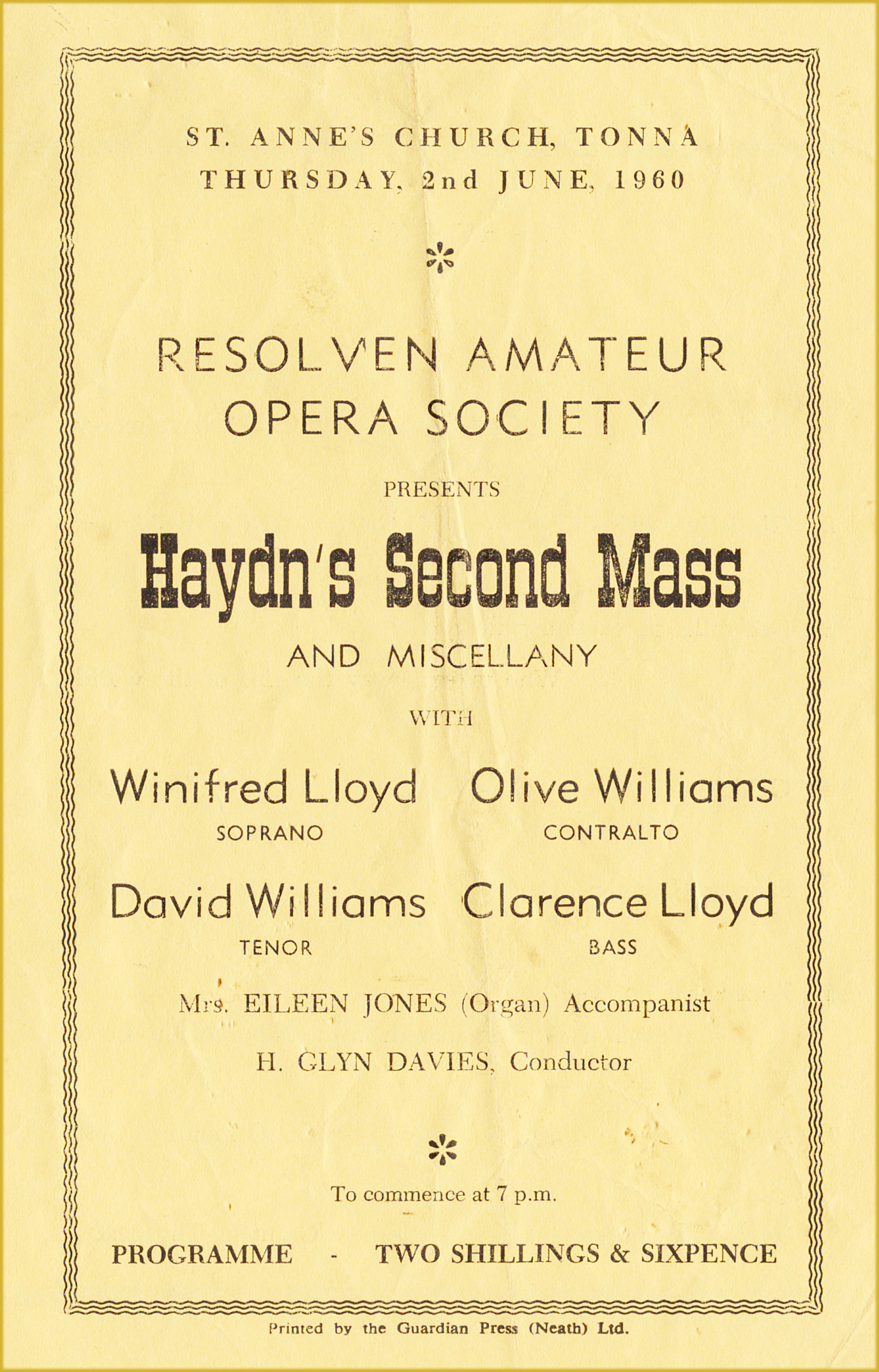In the Resolven concert, Trevor Salter Orchestra accompanied, while in Tonna, Eileen Gethin Jones was the organist.