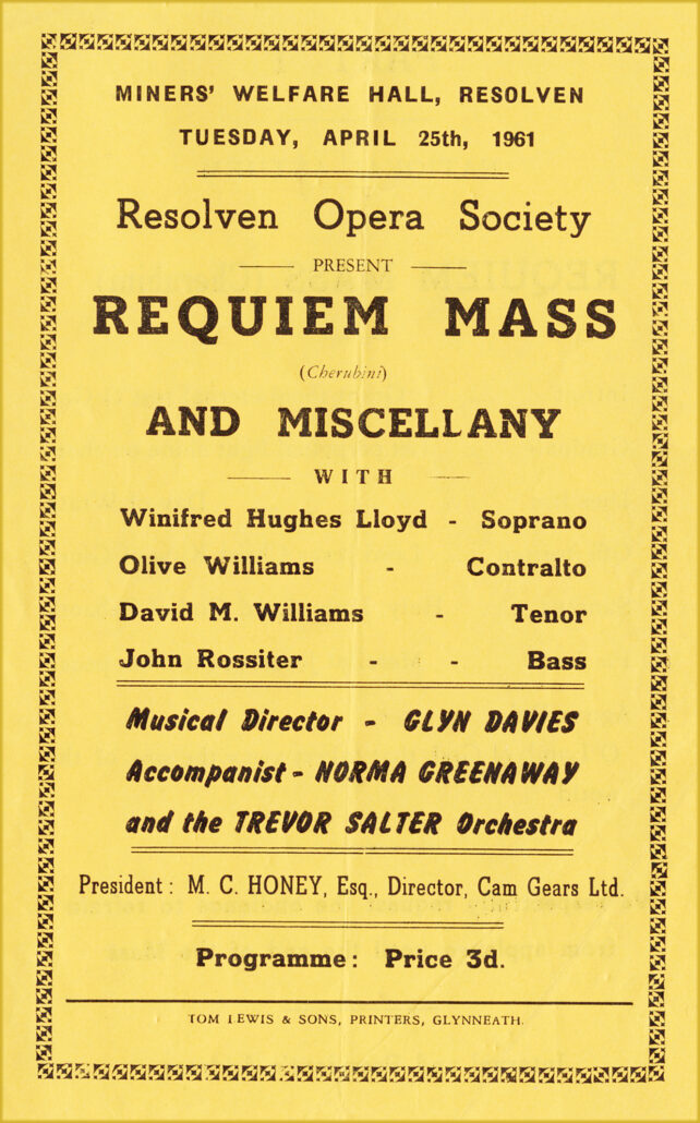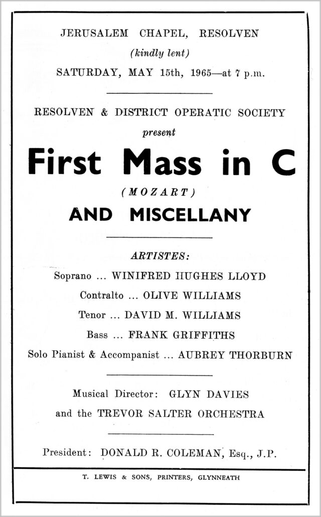 In 1963, the Neath Municipal Choir had decided to hold a concert in March and had again requested assistance from the Resolven Society, so it was thought advisable that the concert in Resolven in April should include the same programme, namely ‘Mozart’s Requiem’ and Haydn’s ‘Spring’ from ‘The Seasons’.