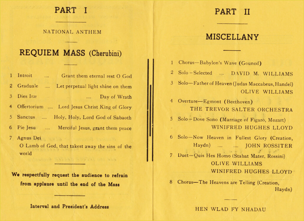 It had become custom and practice for R&DAOS to perform a concert to keep the interest of the members and ‘in good voice’ throughout the year, so for the 1961 Concert Mr Glyn Davies chose Cherubini’s Requiem Mass. The Concert took place on Tuesday 25 April 1961 with Society members as Soloists.