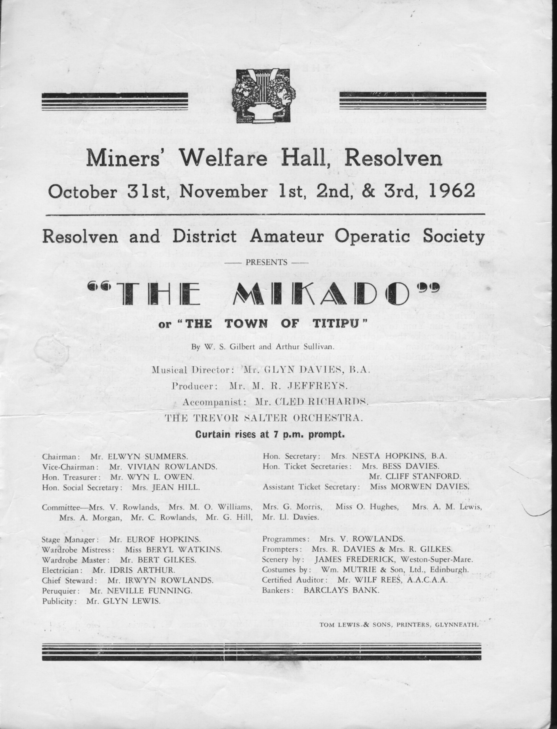Resolven and District Amateur Operatic Society was the first society to take part in a Light Opera Competition sponsored by the Coal Industry Social Welfare Organisation in South Wales. The adjudicator on the night was Mr John Moody, Director of Production for the Welsh National Opera Company. The competition continued for months and the adjudication was not received until the following Summer. Dates of production were October 31st – November 3rd, 1962.