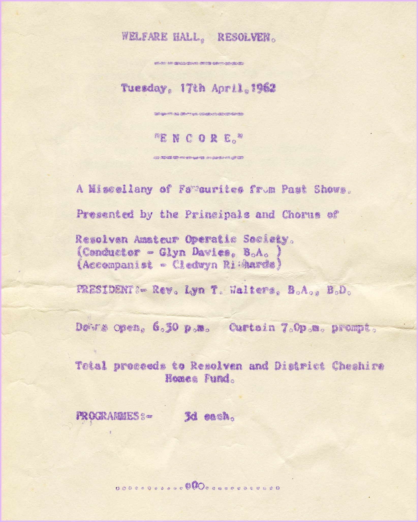 A request was received by the Society for a concert in the Welfare Hall in aid of the Resolven and District Cheshire Homes Fund. This took the form of an ‘Encore’ Concert, on Tuesday 17th April 1962, consisting of choruses, solos and ensembles from a number of operas already performed, soloists being principals who had taken part in those operas.