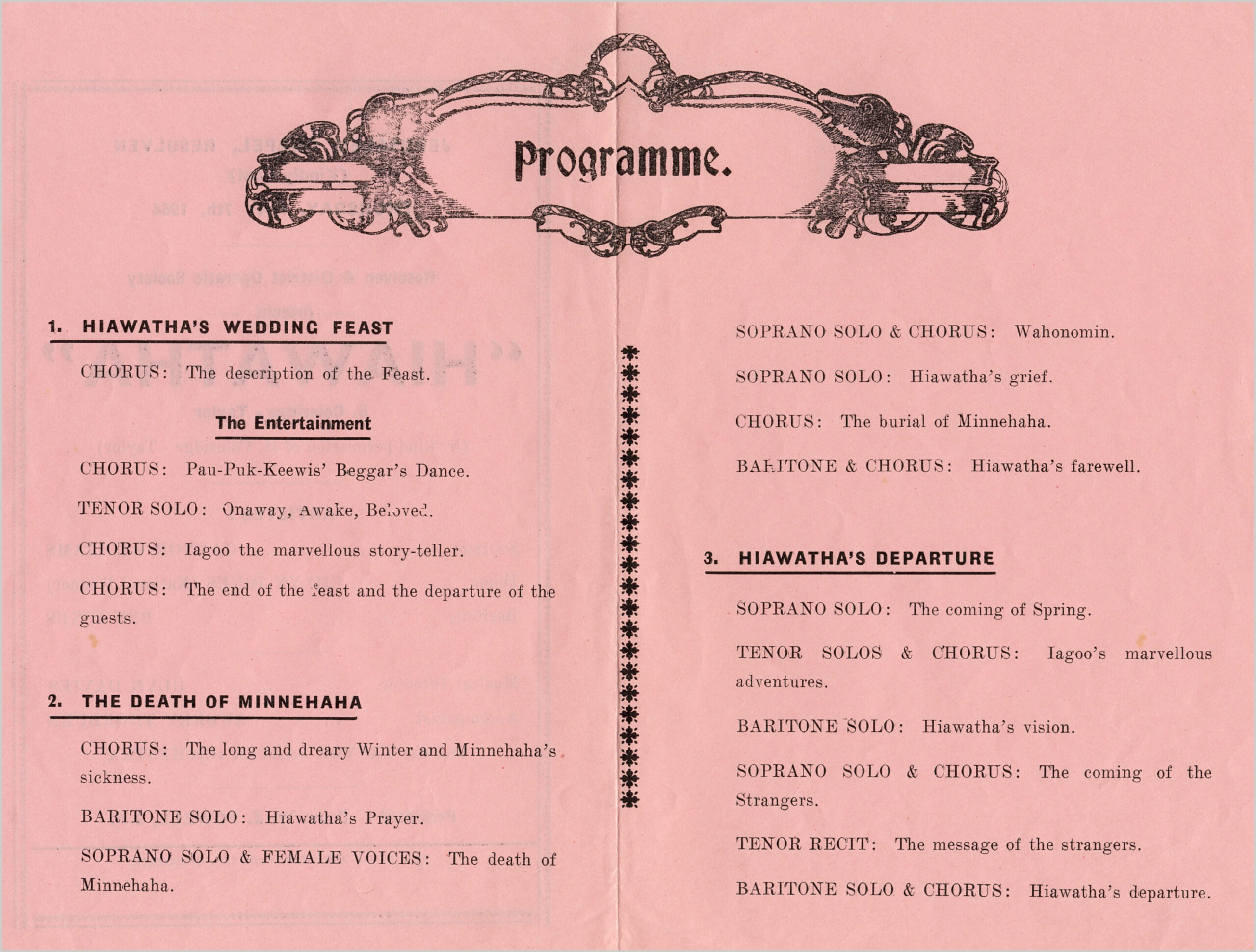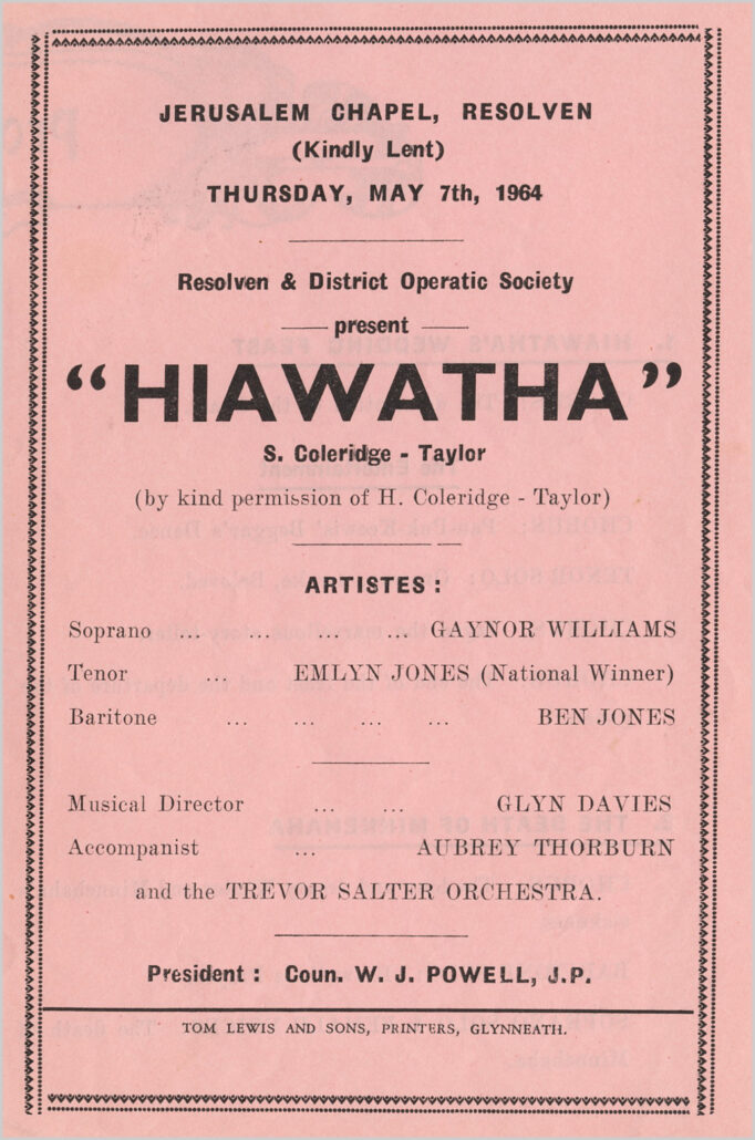 In 1964, the Neath Municipal Choir and the Resolven Society got together and decided to perform two concerts of ‘Hiawatha’ and to help each other with their performances. One concert was held in the Gwyn Hall in April, and the other in Jerusalem Chapel Resolven on 7th May 1964.